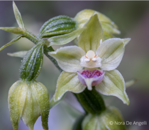Cele mai izbitoare trăsături au fost inflorescențele alungite purtând mai multe flori, discrete, alb-crem, complet închise, atârnate ca un pandantiv, ovare de culoare verde-gălbui, un indiciu clar al unei specii cleistogame, autogame, total diferite de cele cu polenizare încrucișată, chasmogame de ex. E. helleborine.