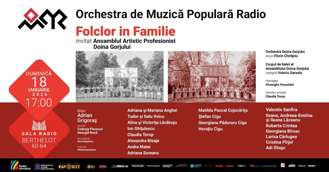 Duminică, 18 ianuarie 2026 (de la 17.00), Orchestra de Muzică Populară Radio (dirijată de Adrian Grigoraș) va invită la Sala Radio la prima întâlnire cu folclorul de calitate din Noul An! Spectacolul sugestiv intitulat „FOLCLOR ÎN FAMILIE” este conceput în jurul principalului invitat al serii: prestigiosul Ansamblu Artistic Profesionist „Doina Gorjului” din Târgu Jiu (manager: Gh. Porumbel, director artistic: Claudia Torop).