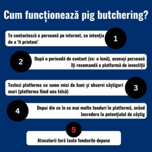 Pig butchering este un tip de fraudă în care atacatorii câştigă treptat încrederea victimelor, pe parcursul unor perioade îndelungate de timp, sub pretextul căutării de prieteni. Ulterior, aceştia vor convinge victimele să depună bani în platforme de investiţii false. Deoarece platformele sunt controlate de atacatori, aceştia pot simula câştiguri semnificative care încurajează victima să depună şi mai multe fonduri. La final, atacatorii fură toate fondurile depuse, de regulă sume foarte mari.