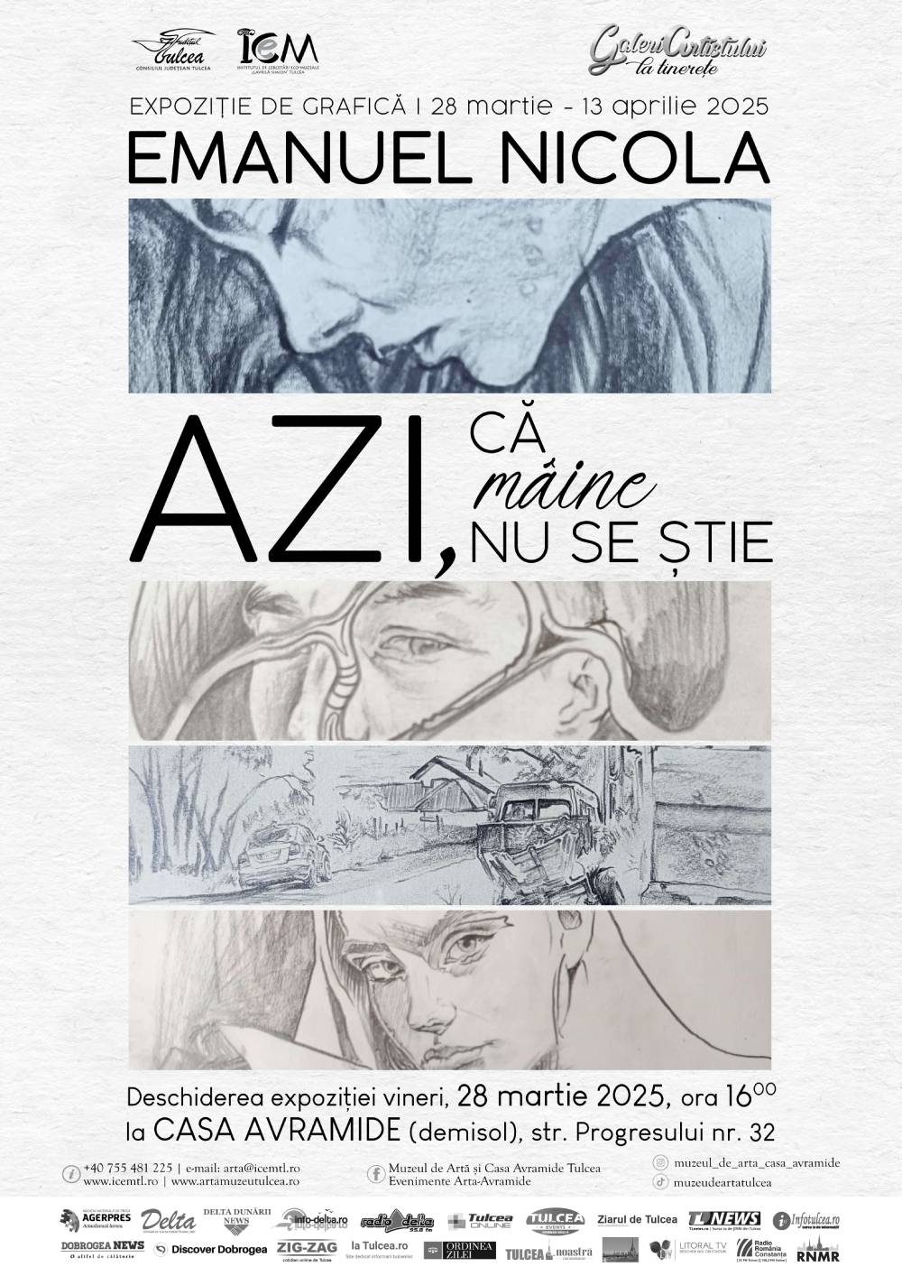 Institutul de Cercetări Eco-muzeale „Gavrilă Simion” Tulcea anunță deschiderea unei noi expoziții din ciclul Galeria artistului la tinerețe la demisolul Casei Avramide. Vineri, 28 martie, de la ora 16:00 are loc vernisajul expoziției de grafică intitulată „Azi, că mâine nu se știe”, semnată de tânărul artist Emanuel Nicola.