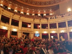 Iubitorii de operă în așteptarea începerii spectacolului.
