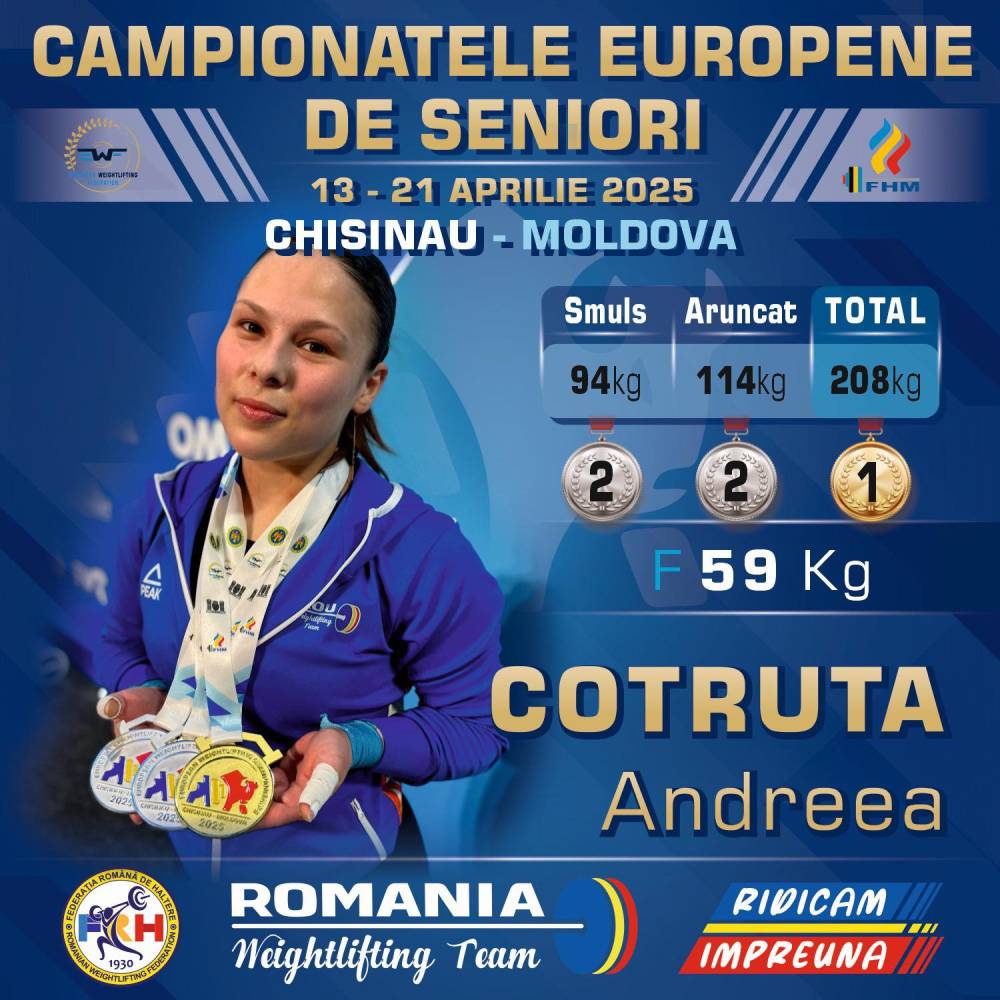 Andreea Cotruța a cucerit titlul european la 59 kilograme, din cadrul Campionatului European de haltere de la Chişinău. Sportiva noastră a avut un total de 208 kilograme.