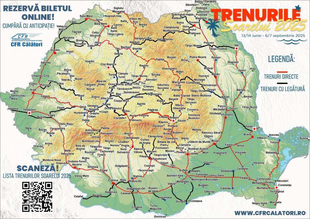 CFR Călători anunţă că, la data de 13/14 iunie 2025, lansează programul estival de transport „Trenurile Soarelui”. Programul se va desfăşura până la data de 6/7 septembrie 2025.