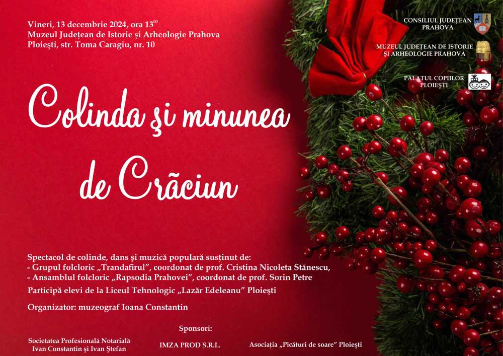 Muzeul Județean de Istorie și Arheologie Prahova, în parteneriat cu Palatul Copiilor Ploiești, vă invită vineri, 13 decembrie 2024, ora 13, să vă bucurați de farmecul Sărbătorilor de iarnă la spectacolul: „Colinda și minunea de Crăciun”.