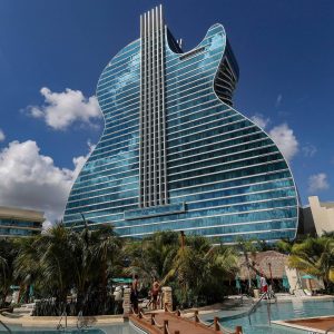 Un hotel în formă de chitară funcționează la Hollywood. Hotelul Seminole Hard Rock, aflat într-o clădire impresionantă în formă de chitară, se află în apropiere de Fort Lauderdale din sud-estul statului american Florida.