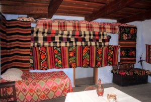 Die Wohnung besteht aus drei Zimmern: dem Schlafzimmer, der Veranda und dem Keller. Alle diesen Räume sind an der Veranda entlang aufgestellt. Die Veranda stützt auf den Holzsäulen, die durch die Arkaden miteinander verbunden sind. Eigentlich wurde das ganze Gebäude aus Eichenholz errichtet. Das Wohnzimmer wurde so aufgeteilt, dass es grossflächig scheint. Die Möbelstücke sind einfach und funktional: ein Bett auf einer Seite und die Kisten. Ein Tisch, der von den Stühlen umgeben wird, befinden sich in der Mitte. Der Herd ist sehr wichtig, der auch einen Backofen hat. Die Kinder oder die Alten können sich im Winter neben dem Ofen erholen.