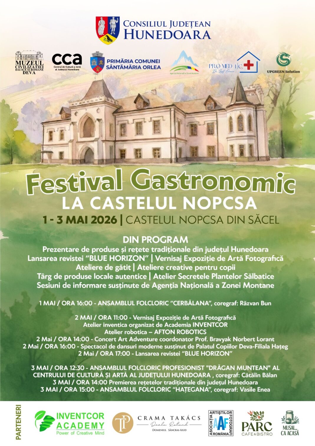 În data de 3 mai, în cadrul festivalului, va avea loc și momentul de premiere a rețetelor tradiționale din județul Hunedoara, urmat de mesaje oficiale susținute de reprezentanți ai administrației județene și locale.