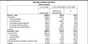 „Principalele resurse de energie primară, în perioada 1.I-31.V.2025, au totalizat 13,519 milioane tone echivalent petrol (tep), în creştere cu 726.900 tep faţă de perioada 1.I-31.V.2024. Producţia internă a însumat 6,906 milioane tep, în scădere cu 342.000 tep (-4,7%) faţă de perioada 1.I-31.V.2024, iar importul a fost de 6,612 milioane tep, în creştere cu 1,068 milioane tep (+19,3%)”, indică INS.
