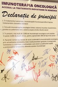 Reprezentanți ai asociațiilor de pacienți, medicilor, industriei farmaceutice și autorităților din domeniul sănătății s-au reunit marți în cadrul unei mese rotunde, organizată la Palatul Parlamentului, sub egida Comisiei pentru Sănătate Publică a Senatului României, pentru a discuta despre imunoterapiile oncologice. Cu aceasta ocazie, a fost au propusa o declarație de principii privind accesul sustenabil al pacienților români la imunoterapiile oncologice.