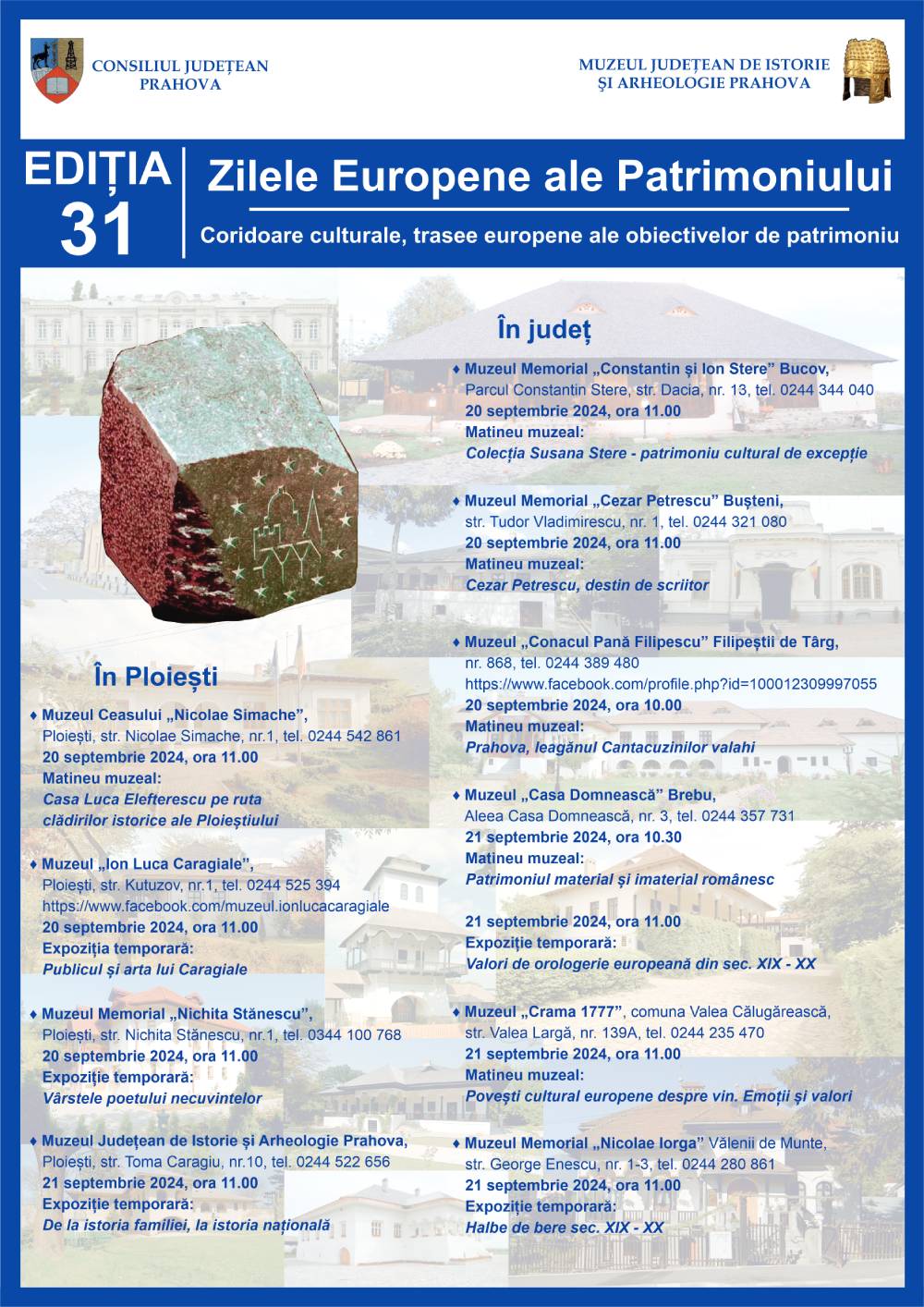 Muzeul Județean de Istorie și Arheologie Prahova și secțiile sale vă invită în perioada 20 -28 septembrie 2024, să participaţi la evenimentele organizate cu prilejul celei de-a XXXII-a ediții a Zilelor Europene ale Patrimoniului, cu tema: „Coridoare culturale, trasee europene ale obiectivelor de patrimoniu”:
