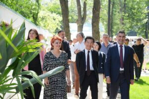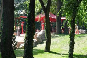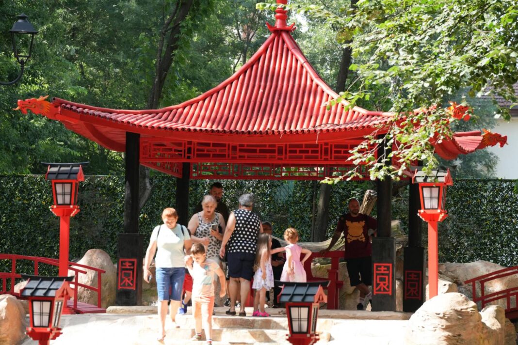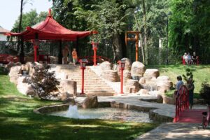 Astfel, zona japoneză este alcătuită dintr-un foișor construit în stil pagodă, străjuit de două cascade ce se revarsă într-un lac, în care sunt amplasate și fântâni arteziene. Intrarea în această zonă se face prin porți tradiționale japoneze, iar pe alei se regăsesc bănci realizate special pentru a se încadra în acest peisaj.