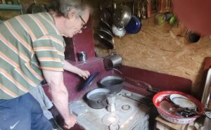 „E bine aici. Înainte locuiam la Nehoiu, la bloc. Ne încurcă însă mult infrastructura, nu e drum”, zice el. Așa că și-au cumpărat un mic tractoraș cu remorcă, cu care își aduc cele necesare. S-a stricat însă ceva la motor și timp de trei săptămâni au trebuit să urce cei 7 km cu rucsacii în spate. Doamna Verginia ne aduce cafea. Și sirop de păpădie, pe care tocmai îl făcuse. Și dulceață de zmeură, din curtea lor.