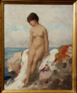 Printre lucrările expuse se află și „Nud la malul mării”, ulei pe pânză. În cazul acestui tablou se observă un contrast puternic între felul în care este tratat corpul tinerei femei și peisajul realizat în tușe scurte și expresive. Poziția personajului amintește de modelele care pozau ore în șir în academiile de artă, însă capul întors ne duce cu gândul la pudoarea unui model mai puțin experimentat.