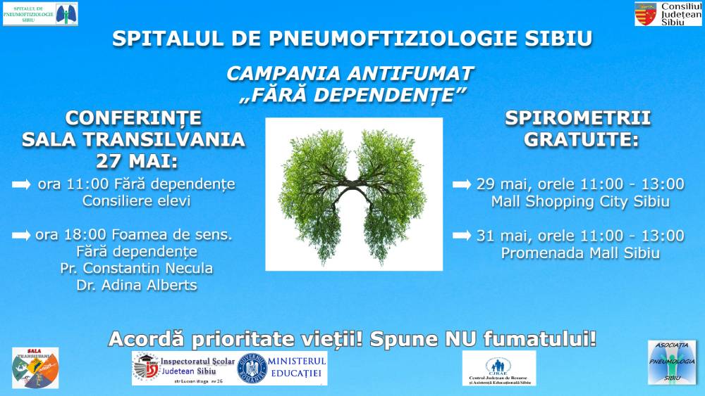 Spitalul de Pneumoftziologie Sibiu organizează în acest an cea de-a VII-a ediție a campaniei anti-fumat, cu scopul de conștientizare a populației cu privire la consecințele negative pe care fumatul le are asupra sănătății. Mesajul campaniei din acest an este „Fără dependențe!”. În acest sens, vor fi organizate atât conferințe, găzduite de Sala Transilvania din Sibiu, cât și sesiuni de efectuare a unor spirometrii gratuite.