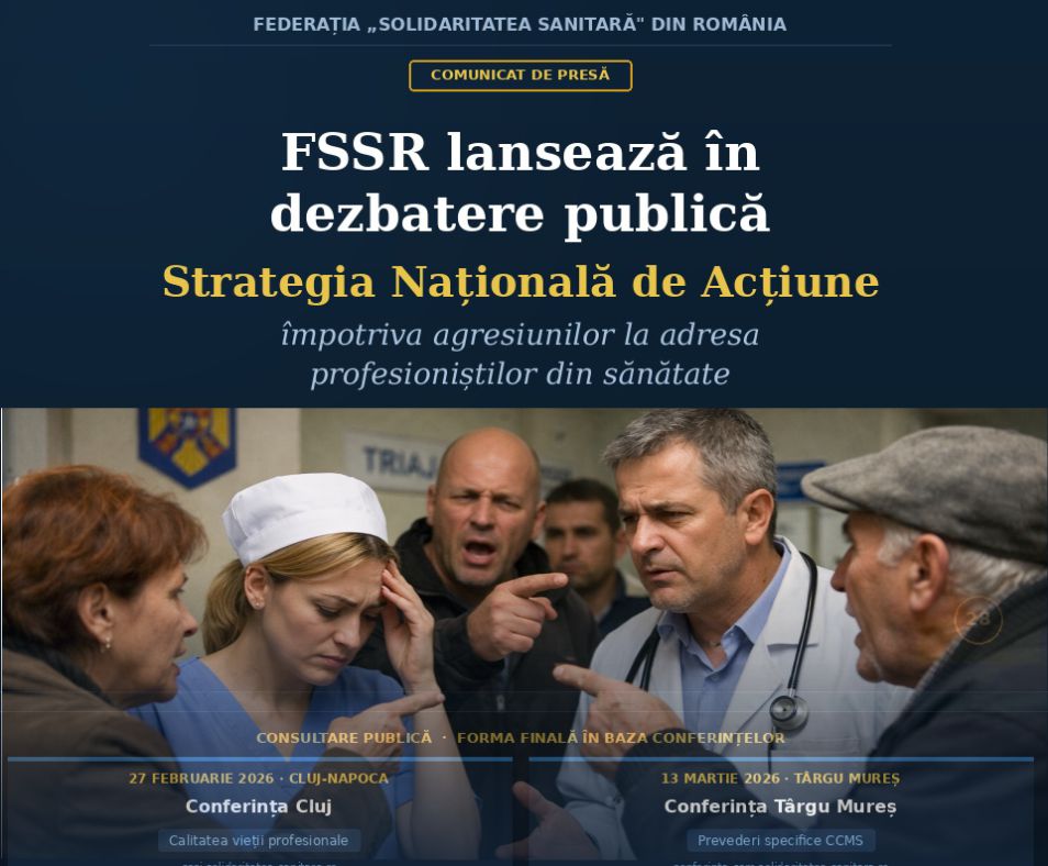 Federaţia „Solidaritatea Sanitară” din România (FSSR) a făcut publică prima formă a Strategiei naţionale de acţiune împotriva agresiunilor la adresa profesioniştilor din sănătate (2026–2030) şi deschiderea procesului de consultare publică a propunerilor formulate în cadrul ei. Iniţiativa sindicatului vine după două incidente care au avut loc în ultimele zile, în care medici au fost agresaţi în timpul programului.