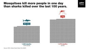 Și într-adevăr, așa cum arată graficul de mai jos, țânțarii ucid mai multe persoane în fiecare zi decât atacurile rechinilor într-un secol întreg.