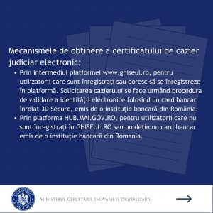 - prin intermediul platformei www.ghiseul.ro, pentru utilizatorii care sunt înregistrați sau doresc să se înregistreze în platformă. Solicitarea cazierului se face urmând procedura de validare a identității electronice folosind un card bancar înrolat 3D Secure, emis de o instituție bancară din România. În urma validării, aceștia vor fi redirecționați către platforma HUB.MAI.GOV.RO, pentru completarea online a cererii tip.