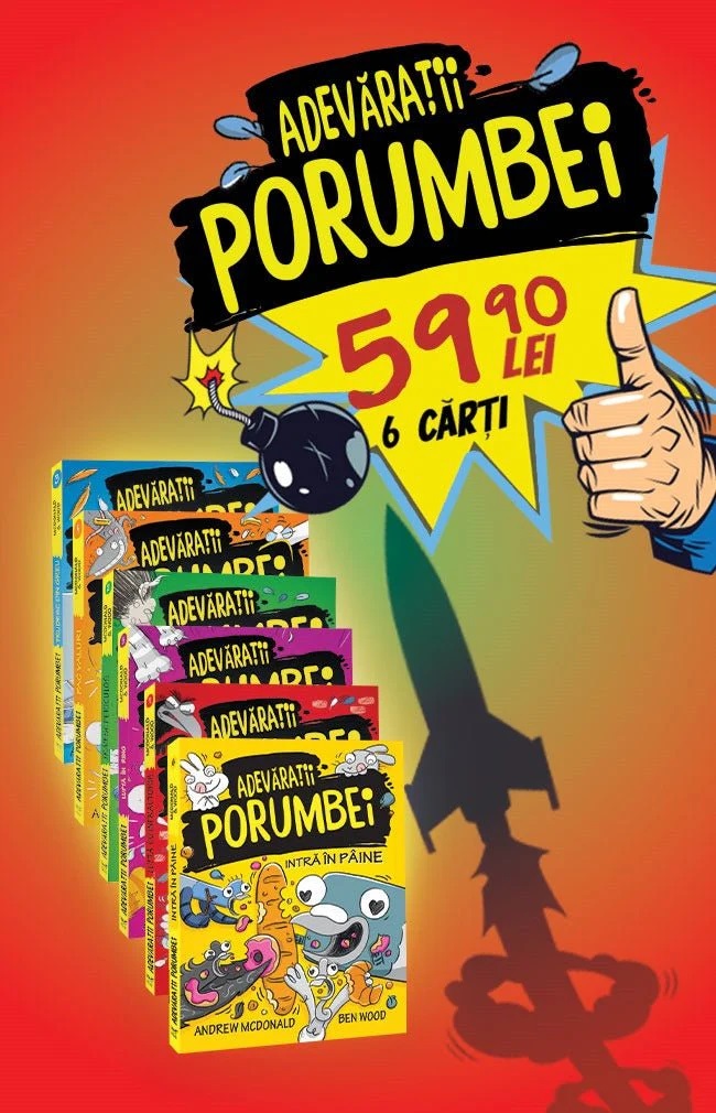 Editura Publisol a pregatit oferte speciale si pentru micii cititori pasionati actiune si farse amuzante. Adevaratii porumbei, colecția de șase volume de benzi desenate despre o echipă formidabilă care protejează orașul, rezolvă mistere și lupta cu infractorii, este disponibilă la prețul special de 69,90 lei. Oferta include pe lângă cele șase volume și două caiete școlare cadou și cutia de colecție.